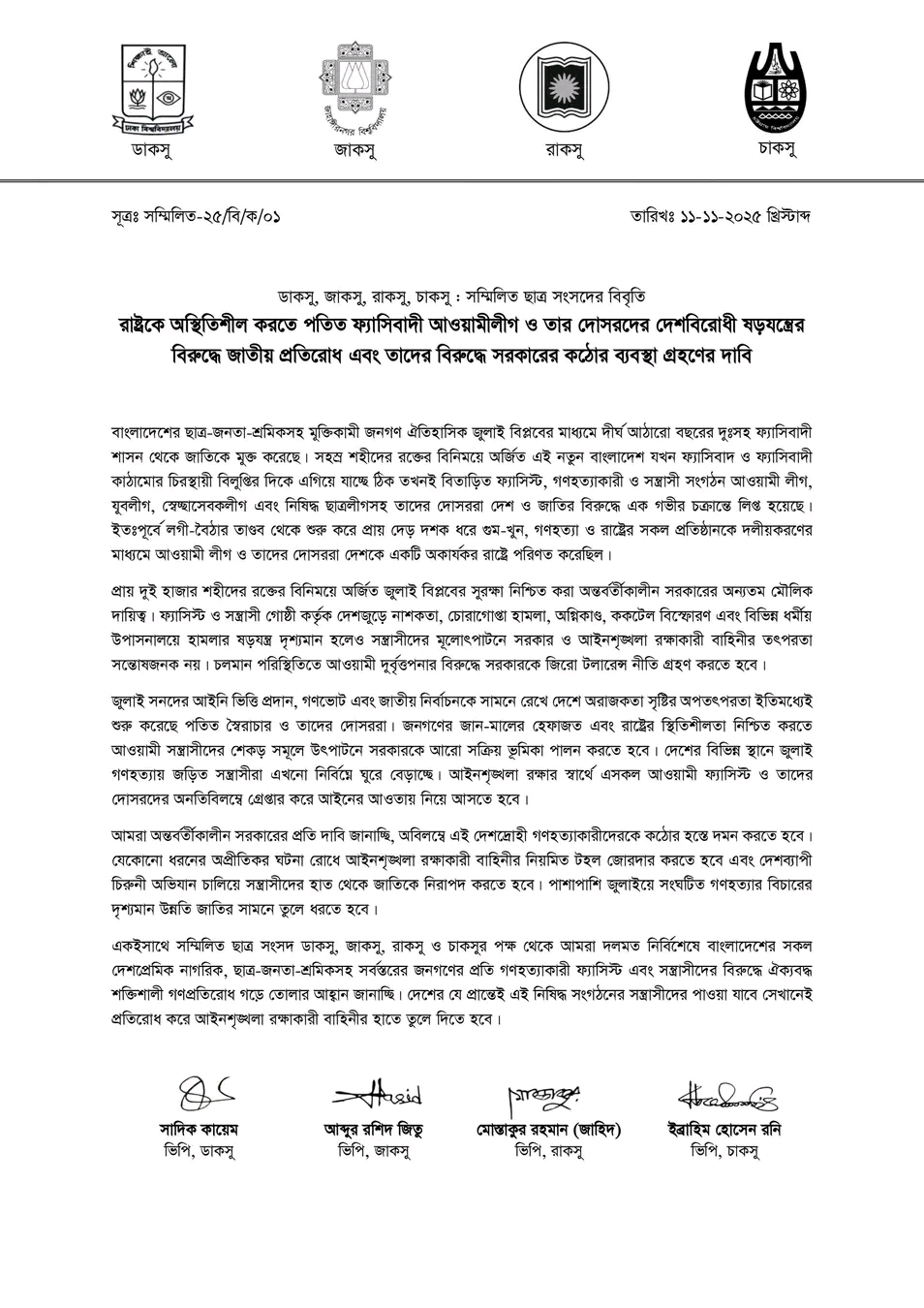 একইসাথে সম্মিলিত ছাত্র সংসদ ডাকসু, জাকসু, রাকসু ও চাকসুর পক্ষ থেকে আমরা দলমত নির্বিশেষে বাংলাদেশের সকল দেশপ্রেমিক নাগরিক, ছাত্র-জনতা-শ্রমিকসহ সর্বস্তরের জনগণের প্রতি গণহত্যাকারী ফ্যাসিস্ট এবং সন্ত্রাসীদের বিরুদ্ধে ঐক্যবদ্ধ শক্তিশালী গণপ্রতিরোধ গড়ে তোলার আহ্বান জানাচ্ছি। দেশের যে প্রান্তেই এই নিষিদ্ধ সংগঠনের সন্ত্রাসীদের পাওয়া যাবে সেখানেই প্রতিরোধ করে আইনশৃঙ্খলা রক্ষাকারী বাহিনীর হাতে তুলে দিতে হবে।