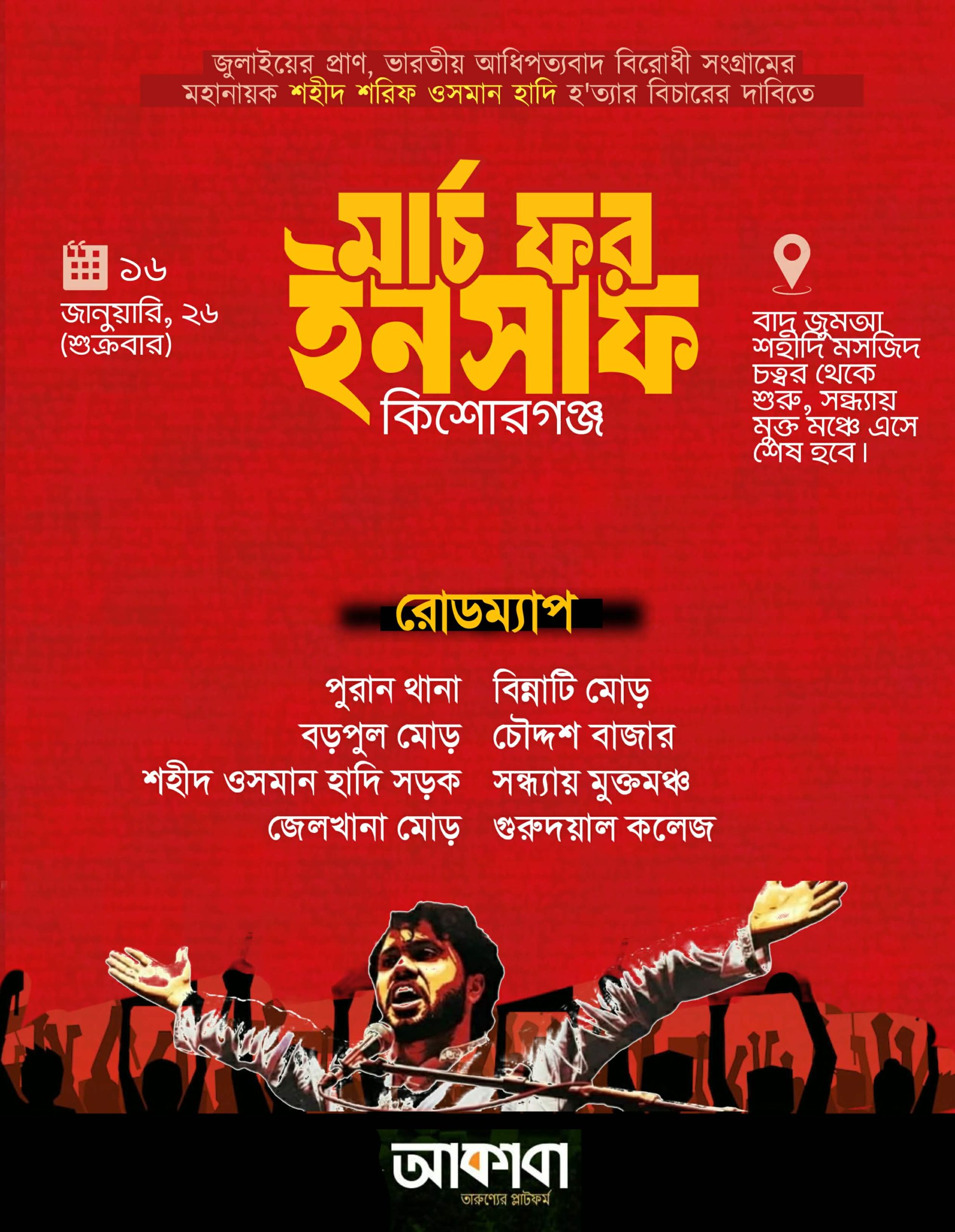 কিশোরগঞ্জের ফ্যাসিবাদবিরোধী ছাত্রজনতার উদ্যোগে জেলাজুড়ে বৃহৎ পরিসরে ‘মার্চ ফর ইনসাফ’ কর্মসূচি পালনের ঘোষণা দিয়েছে অরাজনৈতিক সংগঠন ‘আকাবা’। ভারতীয় আধিপত্যবাদ মোকাবিলায় আত্মোৎসর্গকারী জুলাই বিপ্লবের অন্যতম অগ্রসৈনিক শহীদ শরীফ ওসমান হাদী হত্যার বিচারের দাবিতে এই কর্মসূচির ডাক দেওয়া হয়েছে।