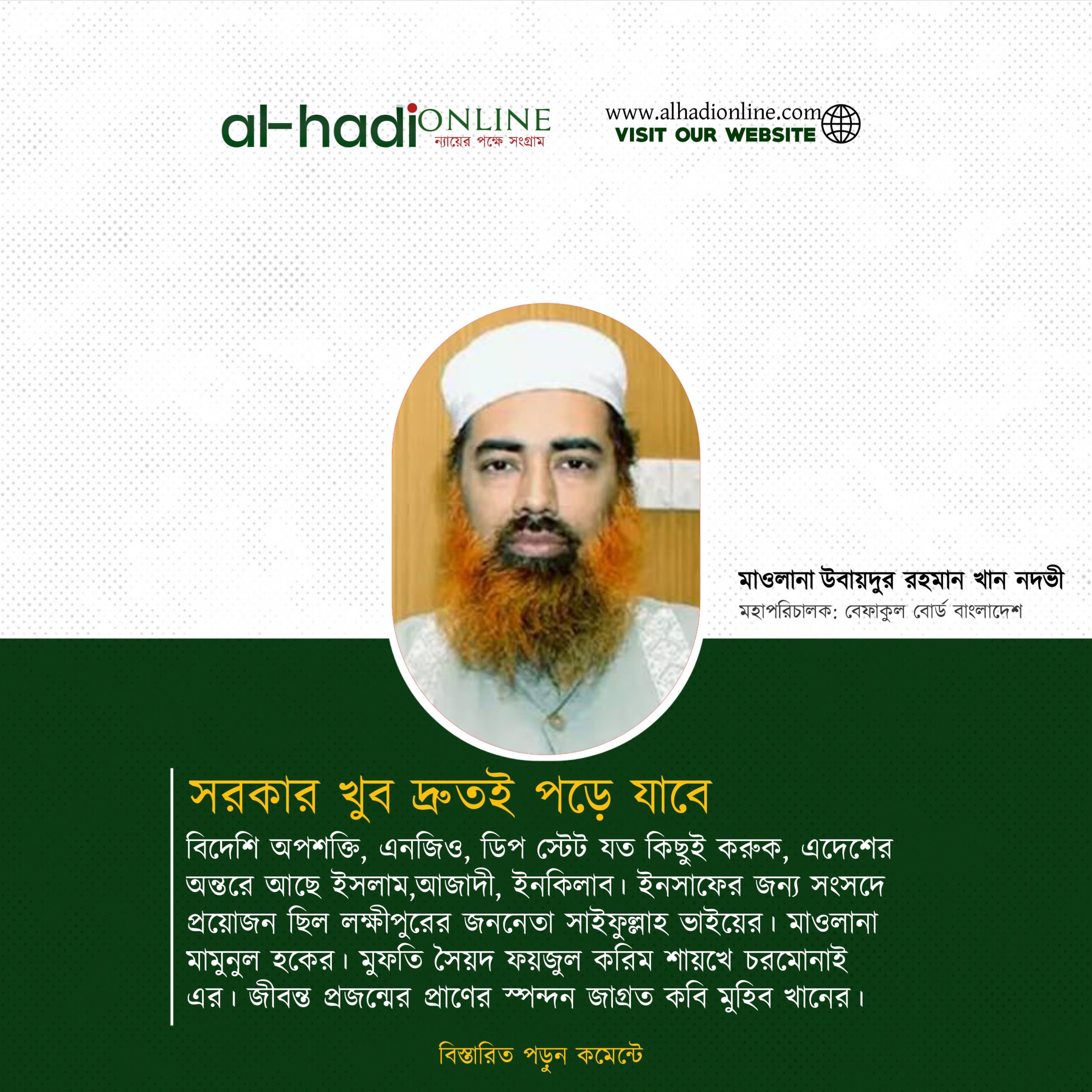 মজলুম কওমী অঙ্গনের দলগুলোকেও এখানে থেমে না গিয়ে আগামীর রাজপথ রাজনীতি আন্দোলন কৌশল ও নির্বাচনে ইসলাম ও দেশ বিরোধী ধোঁকাবাজ প্রতিটি শক্তিকে উচিৎ শিক্ষা দিতে হবে ইনশাআল্লাহ। গতকাল আসিফ মাহমুদ সজীব ভুঁইয়া মাওলানা মামুনুল হক এবং চর মোনাইয়ের পীর সাহেবের সাথে দেখা করেছে। দেশি বিদেশি নানা মহলের তৎপরতার খবর পাচ্ছি। এই নগন্যের কাছেই অসংখ্য দিক থেকে নানা প্রস্তাব পরামর্শ ও পরিকল্পনা আসতে শুরু করেছে। আমিও অসুস্থ শরীর নিয়ে জীবনের শেষ একটা চাল চালব বলে মনস্থ করেছি। হয় বাংলাদেশের সরলমনা মানুষের প্রকৃত বিজয় নয় শহীদি মৃত্যু। ইসলামকে নিয়ে আর কাউকে তামাশা করতে দেবনা ইনশাআল্লাহ।
